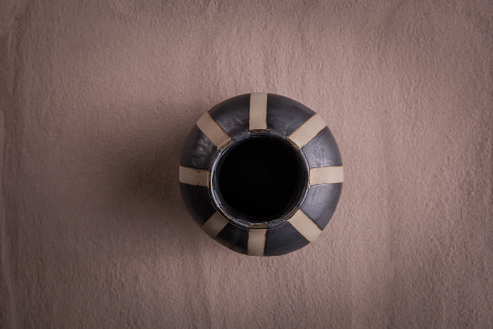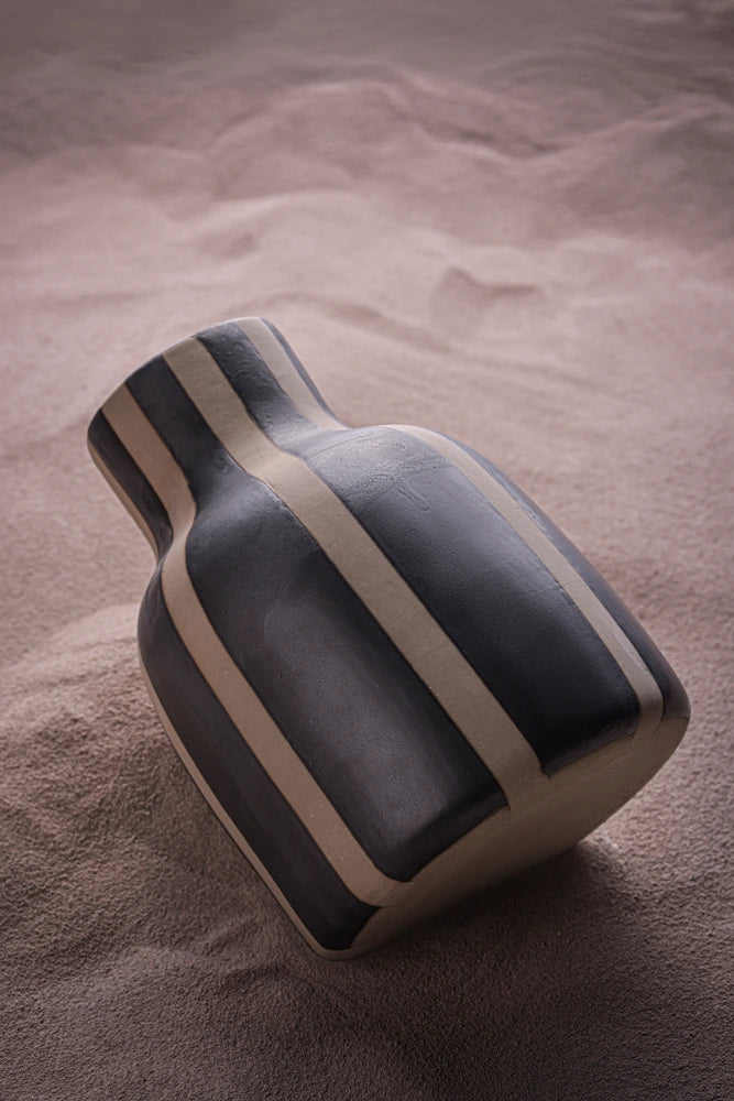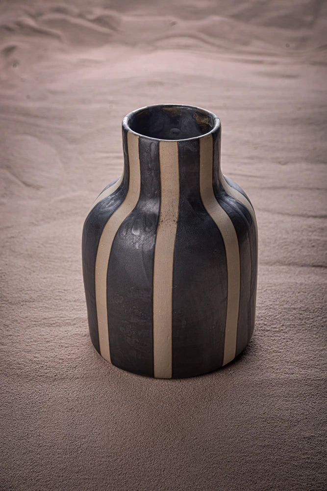 Sleek and refined, these handmade ceramic vases combine a smooth gray clay body with nice black matte stripes which we love. They artisanal finish highlits the natural beauty of the materials while adding a modern touch to any space.